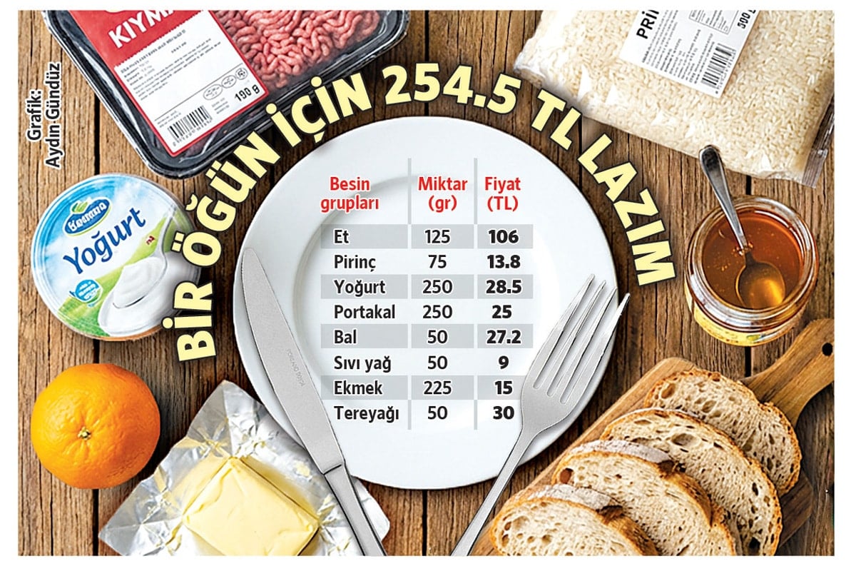 TÜİK 2020’de yaptığı çalışmada bir işçinin aylık harcama gereksinimini hesaplamak için gıdanın payını yüzde 23.1, gıda dışı harcamaların payını ise yüzde 76.9 olarak baz almıştı. TÜİK’in bu tavsiyesi doğrultusunda Sağlık Bakanlığı’nın Türkiye Beslenme Rehberi’nde bir işçi için önerdiği temel besin grupları üzerinden bir gıda harcaması hesabı yaptık. Rehberdeki öneriler doğrultusunda 125 gram et, 75 gram pirinç, 250 gram yoğurt, 250 gram meyve (portakal ya da elma), 50 gram bal, 225 gram ekmek ve 50’şer gram katı ve sıvı yağdan oluşan menünün bir zincir marketten alınan fiyatlarla tek öğün maliyeti yaklaşık 254.5 TL oldu.
